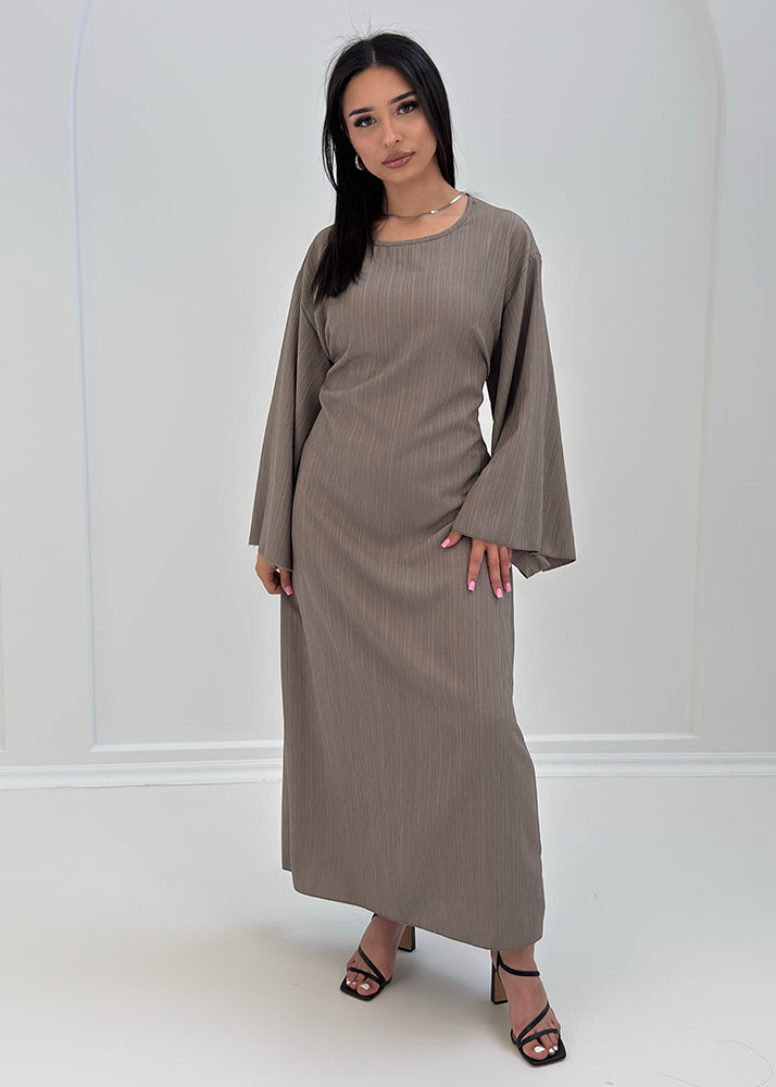 Dieses Maxikleid vereint Eleganz mit Leichtigkeit. Der fließende Stoff, die leicht ausgestellten Ärmel und die feine Struktur verleihen dem Look eine besondere Note. Durch das Bindeband auf der Rückseite lässt sich die Taille individuell betonen und sorgt für eine feminine Silhouette.